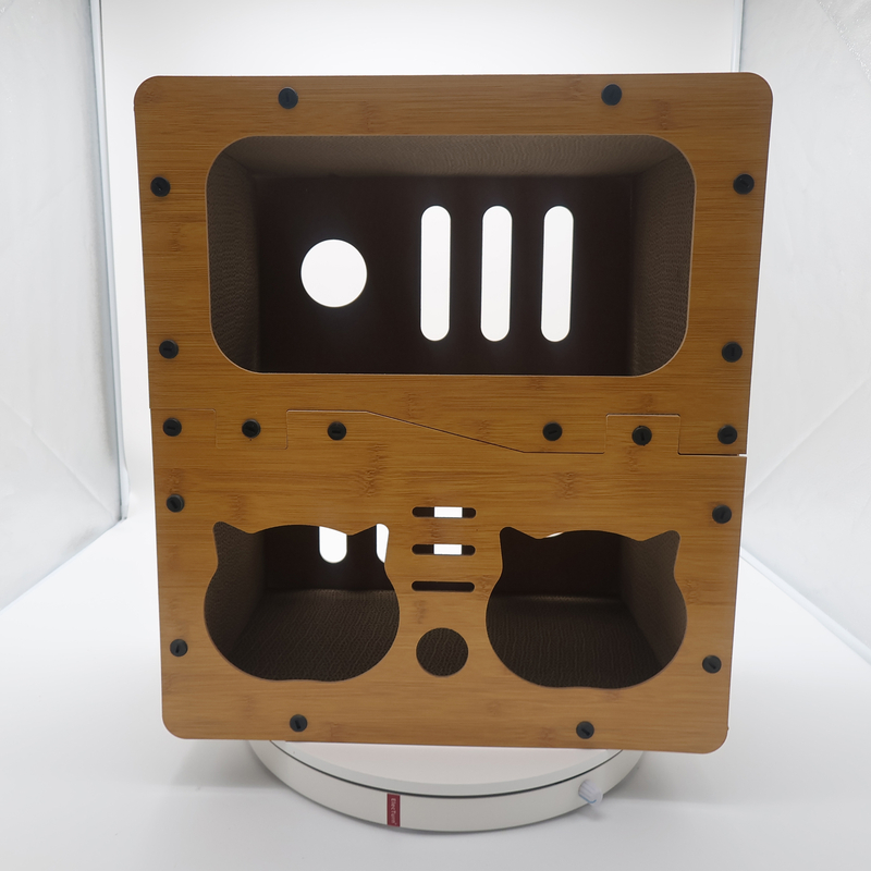 It is a double-layer duplex structure, with thickened corrugated paper scratching surfaces on the upper and lower layers, an independent closed resting space in the middle, and a top observation deck, suitable for multi-cat families.